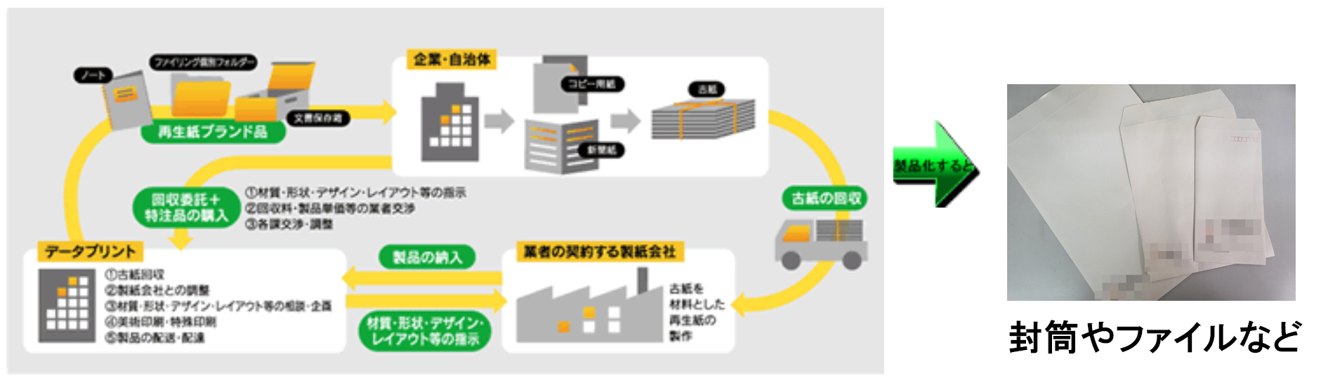当社は古紙を回収し、下記システムの通り、古紙を材料とした再生紙の商品(封筒やファイル等)も取り扱っております。